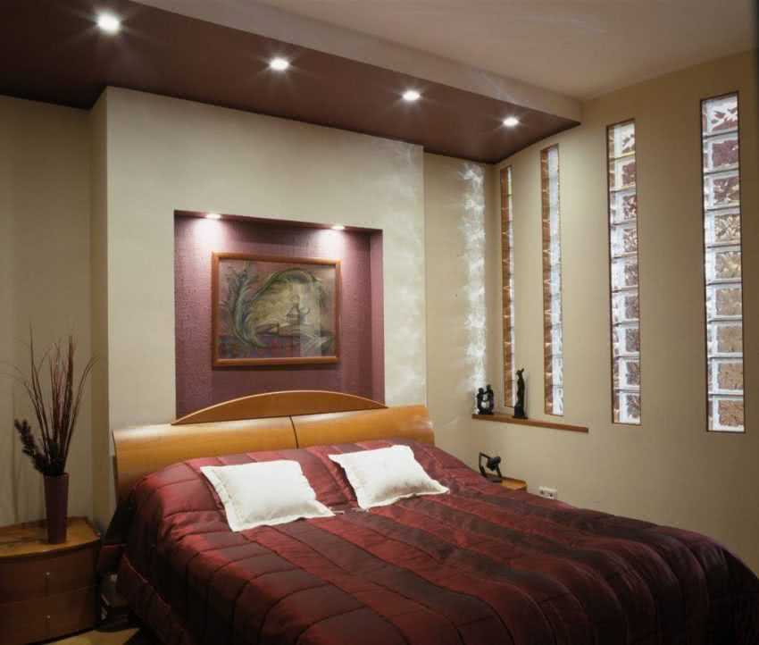- Из гипсокартона вырезают различные фигурки, устанавливают полукруглые, прямоугольные, квадратные короба и арочные конструкции. Светильникам в спальню над кроватью в виде фонарей, факелов, свечей отводится не только роль источников света, но и декоративная функция, главное, чтобы выключатель находился под рукой.