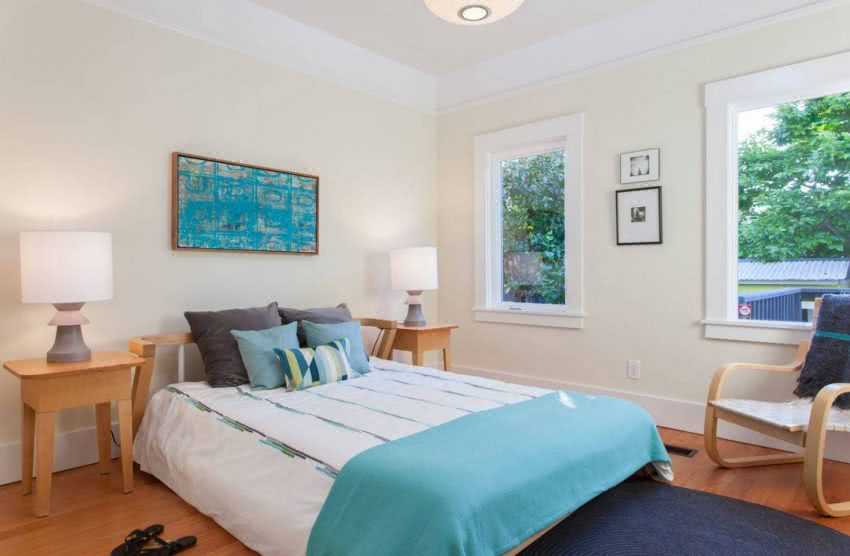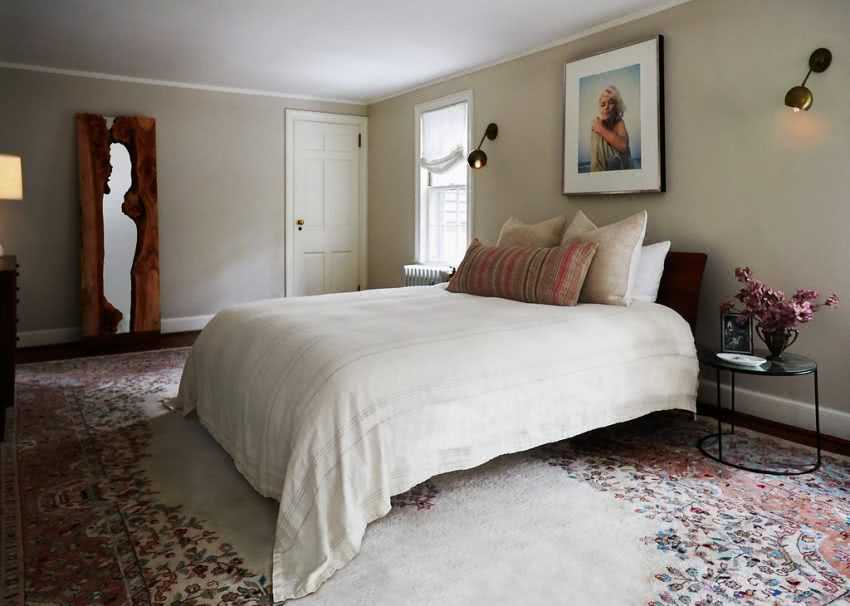 Если красивую и яркую репродукцию или картину повесить в спальне, оформленной в монохромной цветовой гамме, это поможет оживить и разнообразить такой спокойный, однообразный интерьер.