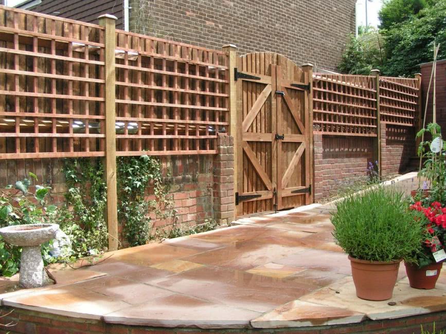 Как и в первом случае, кирпич служит в качестве материала для сооружения несущих элементов: столбов, нижних перекладин и других конструкций. Промежуток между столбами заполняют штакетником или досками, которые могут закрепляться разными способами.