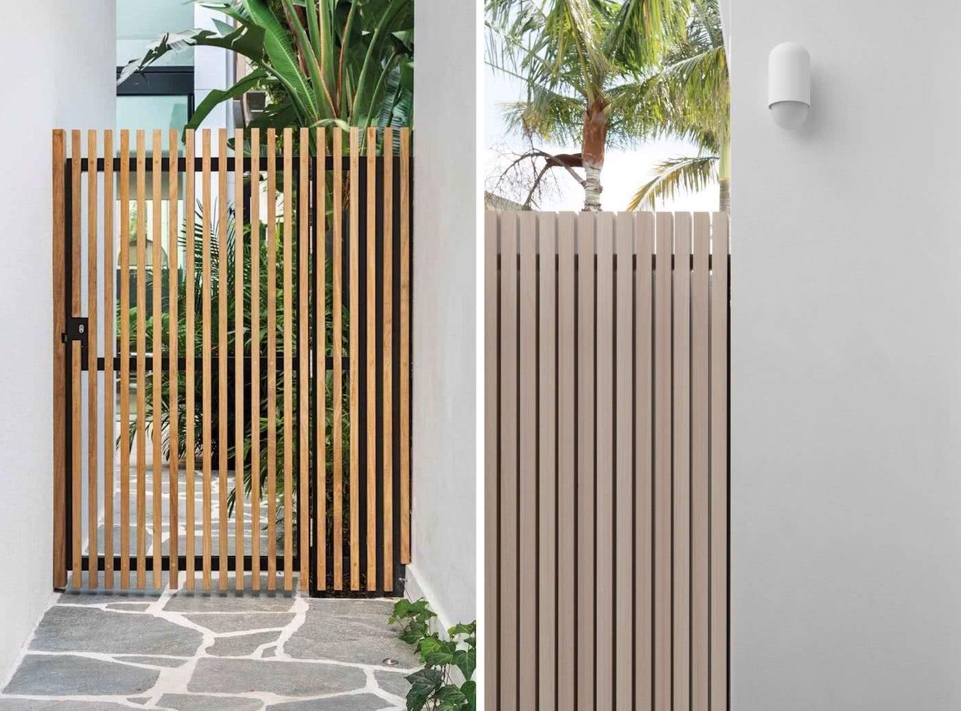 Оригинальный и стильный забор из дерева для загородного дома удается получить, комбинируя деревянные элементы с пергонами или габионами.