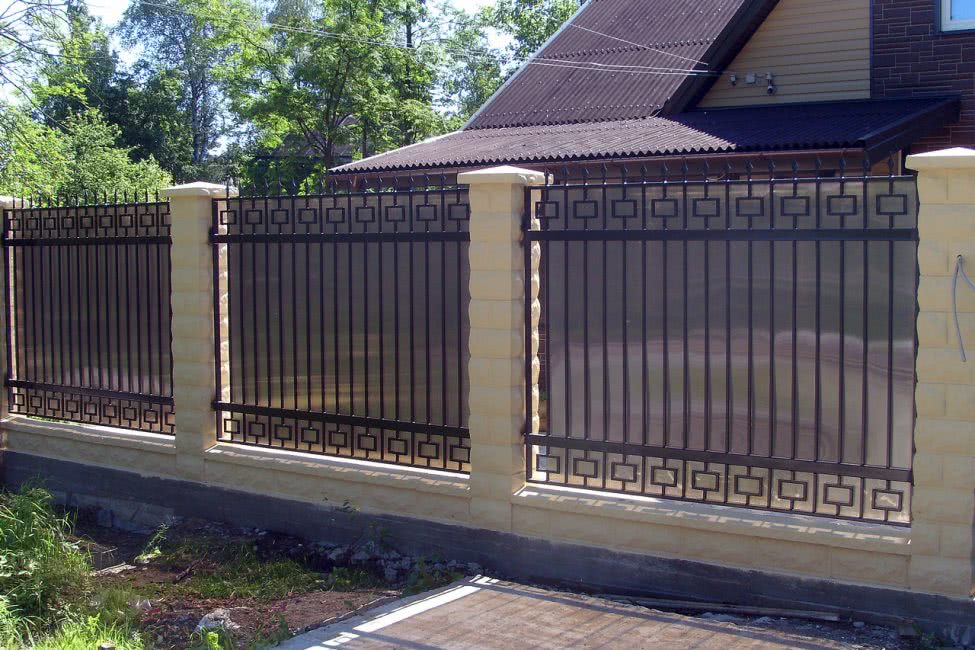Обычно из кирпича сооружают столбы, фундамент и другие несущие конструкции. Профилированные листы, штакетник, металлические сварные или кованые конструкции используют для изготовления секций.