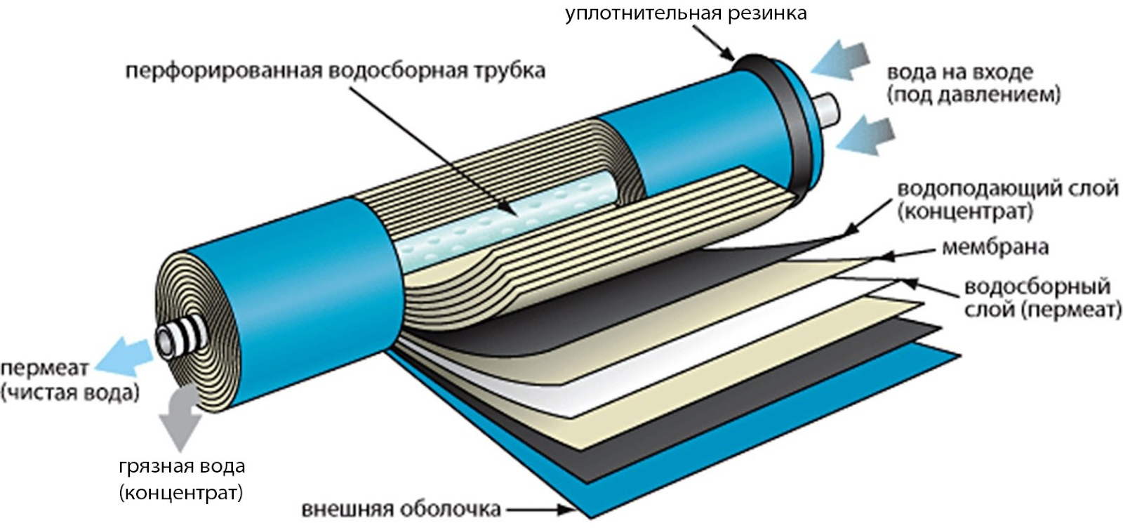 Высокотехнологичная мембрана пропускает через себя только чистые молекулы, а все остальные примеси остаются в грязной, которая удаляется из системы в канализацию.