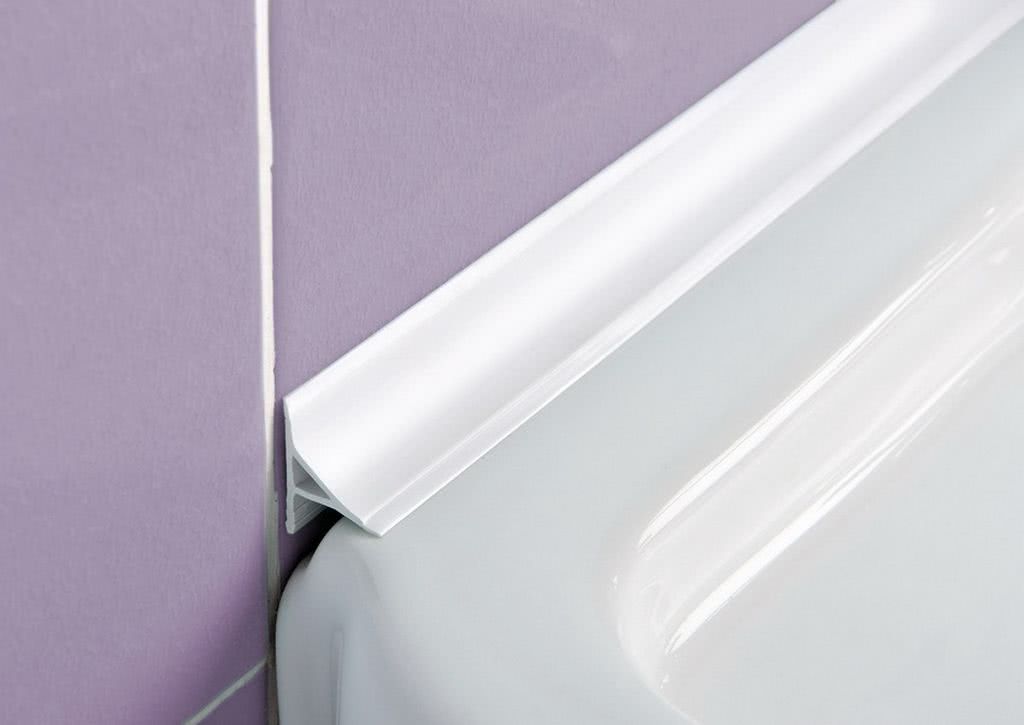 Пластиковый бордюр для ванны может быть, как обычным, так и самоклеящимся. Чаще всего их применяют в случаях облицовки стен санузла ПВХ панелями. Они могут быть в виде уголка или ленты шириной 3-6см и длиной 1,8-3м.