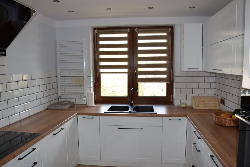 Глубокий черный цвет эффектно смотрится на фоне белоснежных фасадов. При этом создается иллюзия расширения пространства, поэтому такая комбинация рекомендуется при обустройстве маленьких кухонь.
