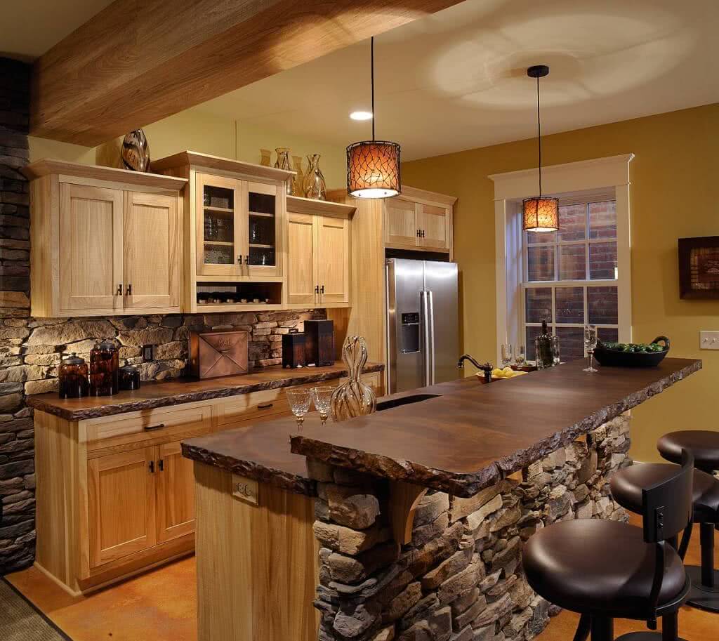 Облицовка искусственного камня смотрится уместно в обрамлении интерьера со схожим направлением стиля кухни.