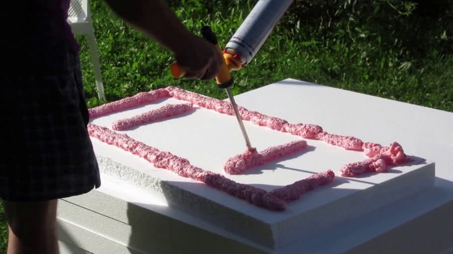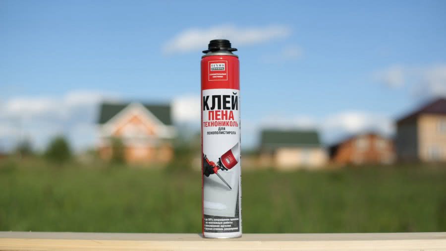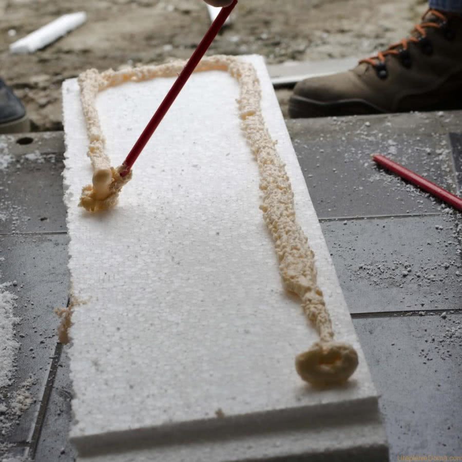 Так называемая монтажная пена имеет несколько видов. Нужно выбрать ту, в составе которой нет запрещенных для контакта с пенопластом компонентов. Обычно используют состав на основе полиуретана или пенополистирола.