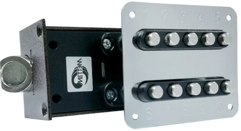 Меттэм ЗКП-1: секретность замка – не менее 1000 вариантов комбинаций. Предназначается для подъездных и гаражных дверей, а также для установки на воротах и калитках, толщина металлического полотна которых равна 30 мм.