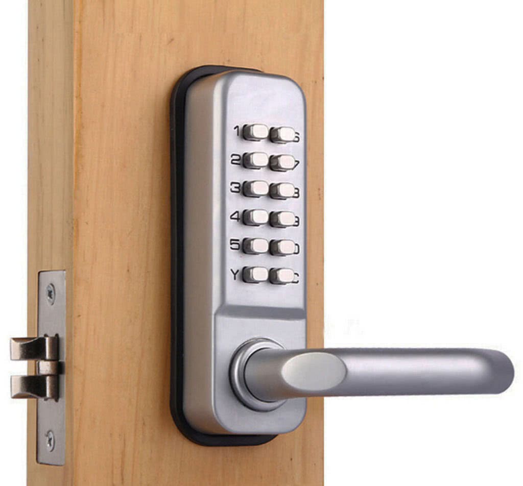 Механическая модель очень популярна и устанавливается во многих подъездах высотных домов, закрытых учреждений и территорий. Может располагаться как на правой, так и на левой стороне дверного полотна. Снаружи отпирается путем нажатия определенного набора цифр.