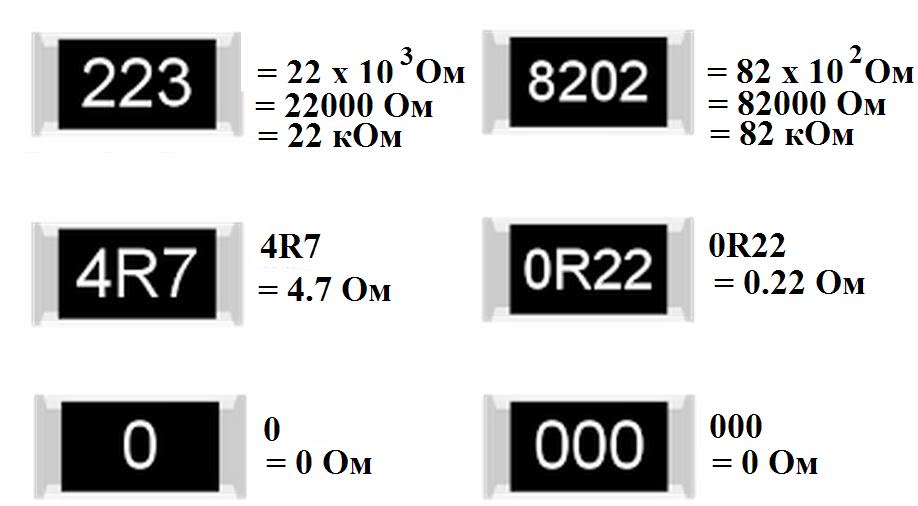 Сопротивление менее килоома записывают как число без единиц измерения; сопротивления от одного килоома и выше, но менее одного мегаома, выражают в килоомах и рядом с цифрой ставят букву «к»; сопротивления от одного мегаома и выше записывают как число, добавляя рядом букву «М». Например, 10 М (10 мегом), 5,1 К (5,1 килоом); 470 (470 Ом); К68 (680 Ом).