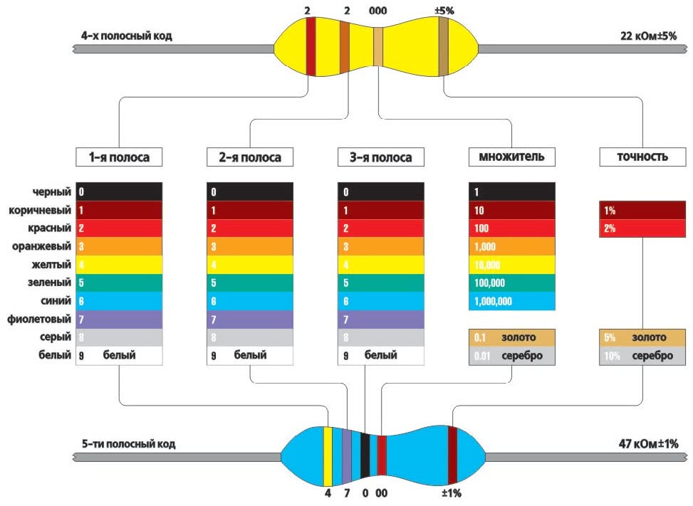 Значение сопротивления обычно указано на поверхности резисторов. Для маркировки малогабаритных резисторов используют буквенно-цифровой код или цветовой код, состоящий из цветных полосок.