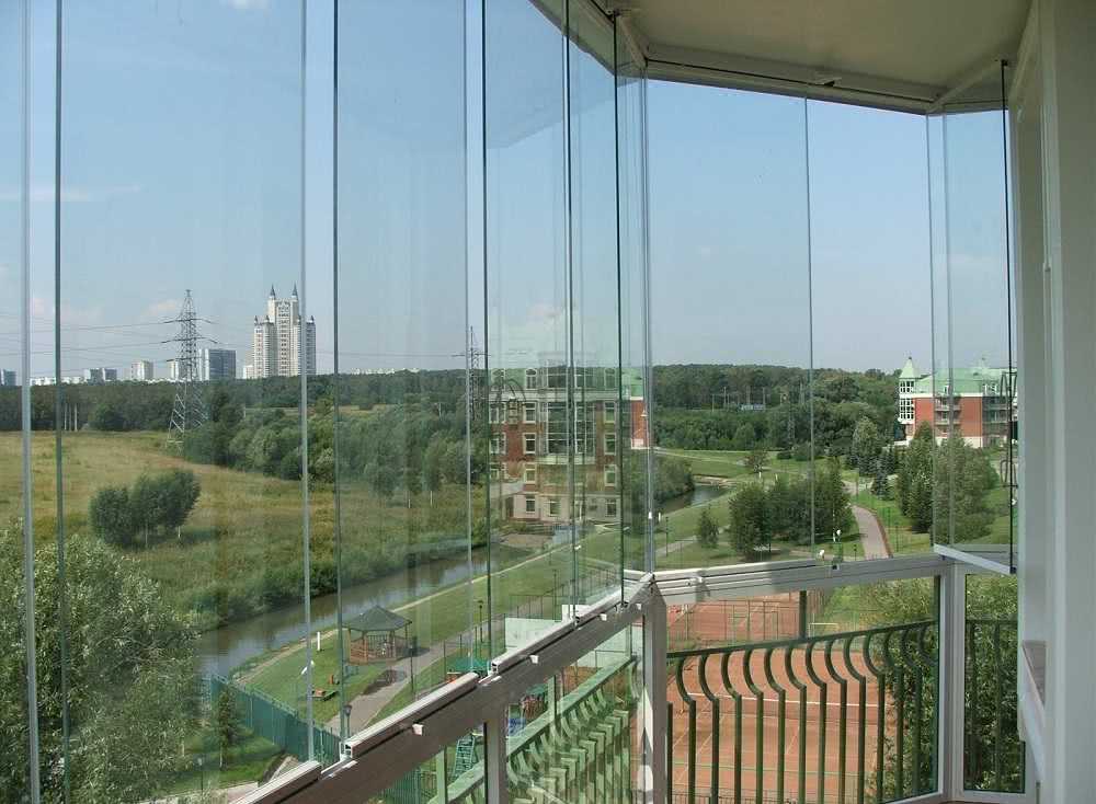 - Безрамное остекление – без большого количества перемычек. Такие окна могут открываться и закрываться по принципу работы шкафа-купе.