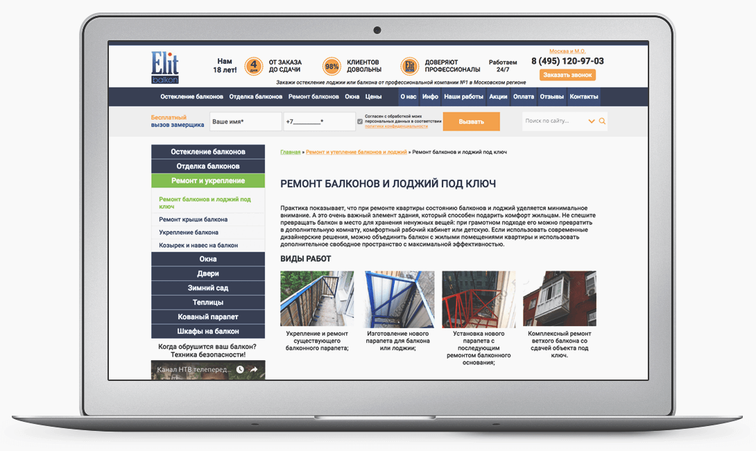 Отметим, что компания Elitbalkon работает на рынке благоустройства балконов и лоджий с 2000 года, и её сотрудники знают всё о ремонте и реставрации балконов. Одно из главных преимуществ — это следование строительным правилам. Компания Elitbalkon монтирует балконы на металлокаркасах по собственной технологии, придерживается подходящих под деятельность ГОСТов и проводит полный контроль всех этапов ремонта и отделки балкона.