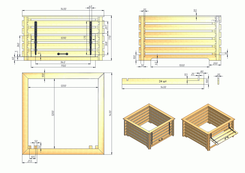 - Нижнюю часть передней стенки (примерно на треть) сделать съёмной — для того, чтобы выгребать оттуда уже готовое удобрение.