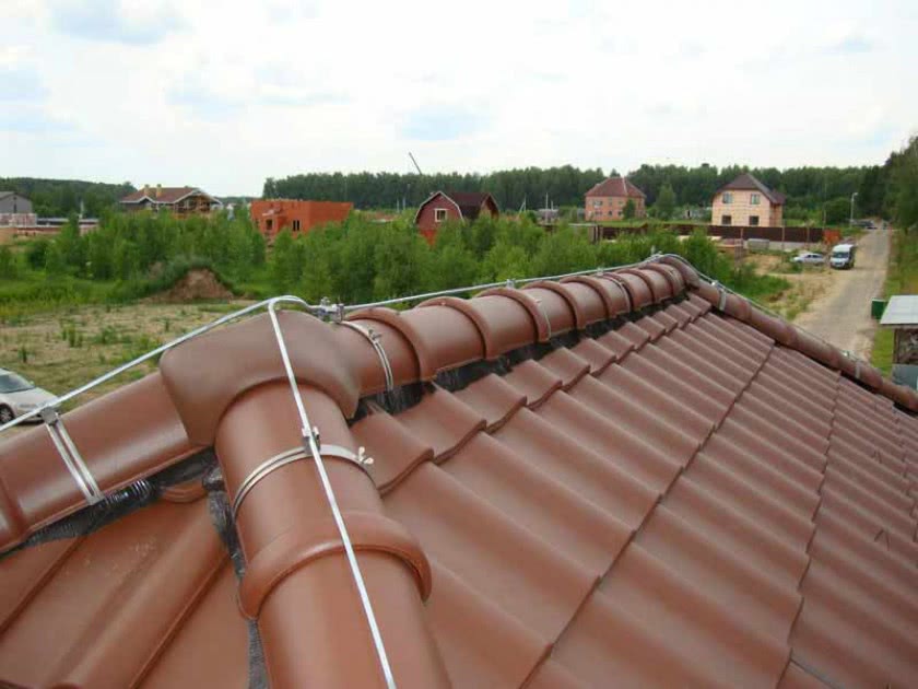 Надо сказать, что абсолютно также устанавливается планка для крыши из металлочерепицы. Единственное, профиль используется специальный — фигурный, напоминающий черепицу. Он крепится к металлочерепице саморезами, которые вкручиваются в верхний гребень листов.