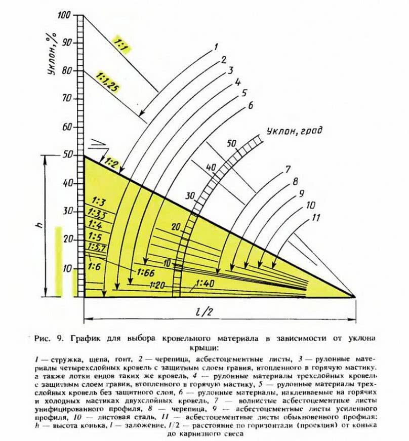 Определить уклон конструкции двухскатной крыши непросто. Учитывают вид кровельного покрытия. Зависимость такая: