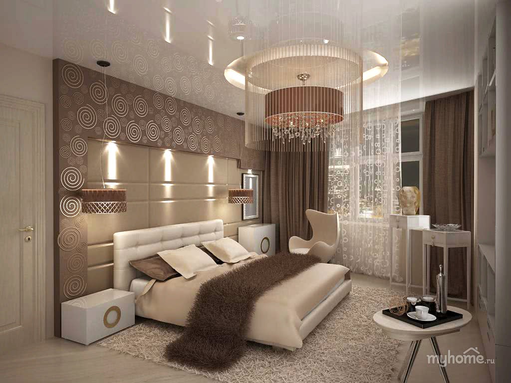Коричневый считается цветом элегантности и солидности, который на протяжении многих поколений широко использовался в отделке жилых комнат. Белая постель на таком фоне уже сама по себе смотрится идеально, составляя прекрасный «дуэт» со стенами и мебелью. Но атмосфера спальни должна не столько стимулировать активность, сколько располагать к отдыху. В пару к белой постели можно сделать чисто белый потолок и расставить белую мебель. Если белый смотрится слишком контрастно, стоит остановить выбор на кремовом, бежевом или молочном цвете. Используя множество коричневых оттенков и их комбинации, можно отлично подчеркнуть достоинства и скрыть недостатки планировки.