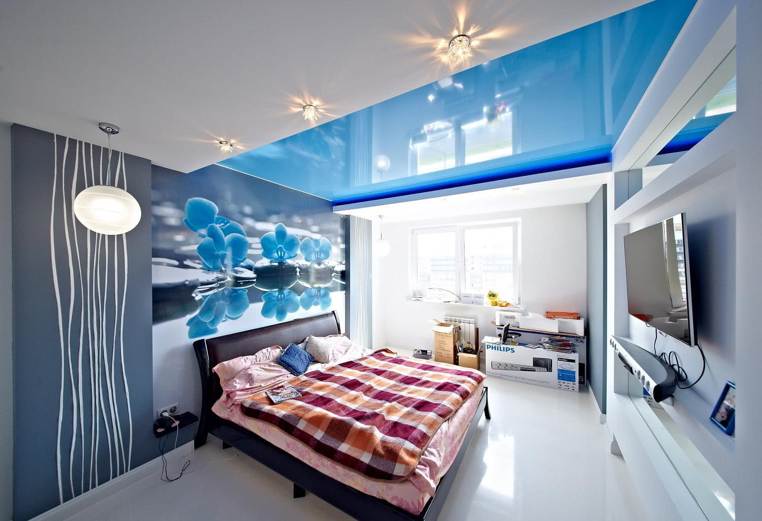 Еще недавно краситель индиго стоил дорого и ему не был альтернативы. Но благодаря появлению натяжных конструкций установка синего потолка в квартире теперь не проблема. Но сначала необходимо определиться с фактурой, это влияет на внешний вид комнаты и величину пространства. Поверхность и её отражающий коэффициент способны «раздвинуть» стены или создать ощущение тесноты и давления.