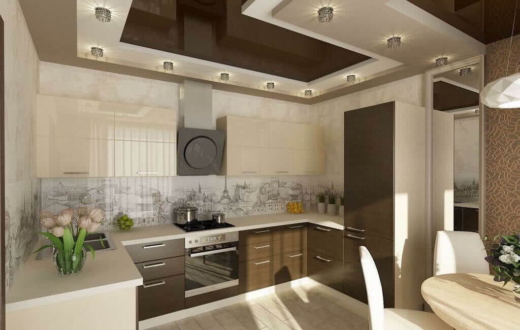 Сочетание натяжного потолка с гипсокартоном, позволяет создавать креативные и удивительные конструкции. Комбинированная двухцветная потолочная модель в бело-коричневых тонах, будет смотреться очень гармонично и эстетично.