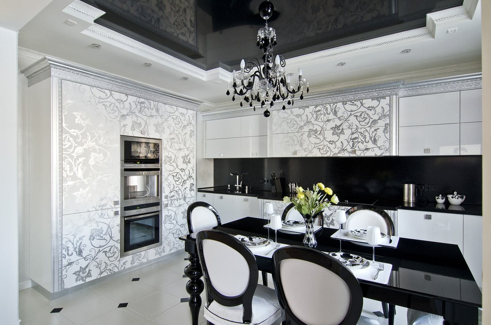 Довольно сложный цвет, но при правильно подобранном оформлении преображает комнату. Практически всегда выбирают вариант с лаковым полотном. Чёрный в большой концентрации вызывает мрачные ощущения. Его чаще используют в сочетании со светлыми тонами (прежде всего, белым).