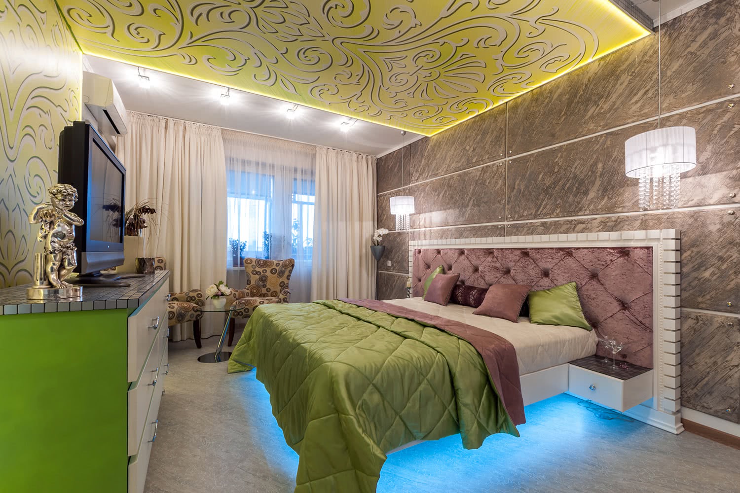 Обратите внимание: На примере оттенок потолка подобран в близком соответствии с основным текстилем. Это помогает создать целостный, законченный интерьер