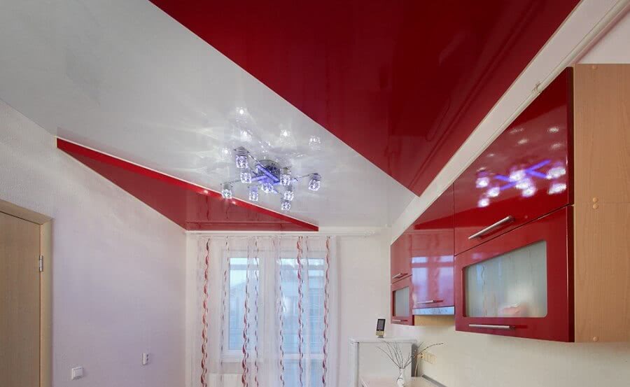 В глянце потолок выглядит ярче, с матовой поверхностью — сдержаннее и спокойнее. Более тёмный вариант красного — бордовый или винный. Выглядит благородно и изысканно.
