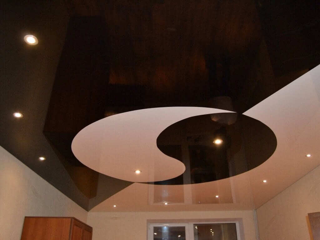 Тканевые натяжные потолки не сшивают — они натягиваются лишь цельным полотном. ПВХ-пленку паять можно, чем повсеместно пользуются дизайнеры, создавая причудливые орнаменты и комбинации. Но у двухцветных вариантов есть свои особенности: