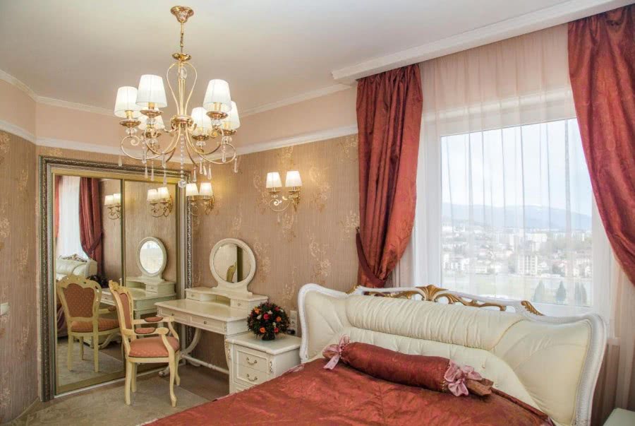 Темная мебель. Светлая смотрится недорого. Для того чтобы придать величия комнате, лучше подбирать предметы благородных оттенков. Они не нуждаются в дорогой фурнитуре, а также выступают самостоятельными элементами интерьера.