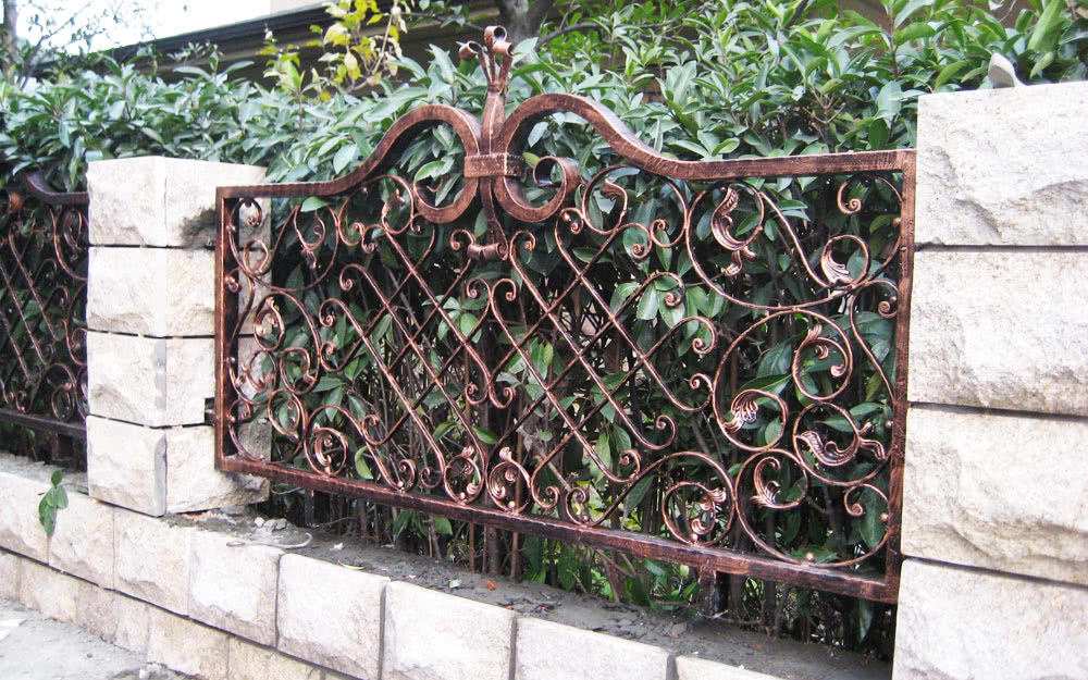 Декоративные изделия. Обычно они выполняют только декоративную функцию, поскольку их делают невысокими. Такие красивые кованые заборы не препятствуют легкому проникновению на огражденную территорию, поэтому для ограждения частных владений их обычно не используют.