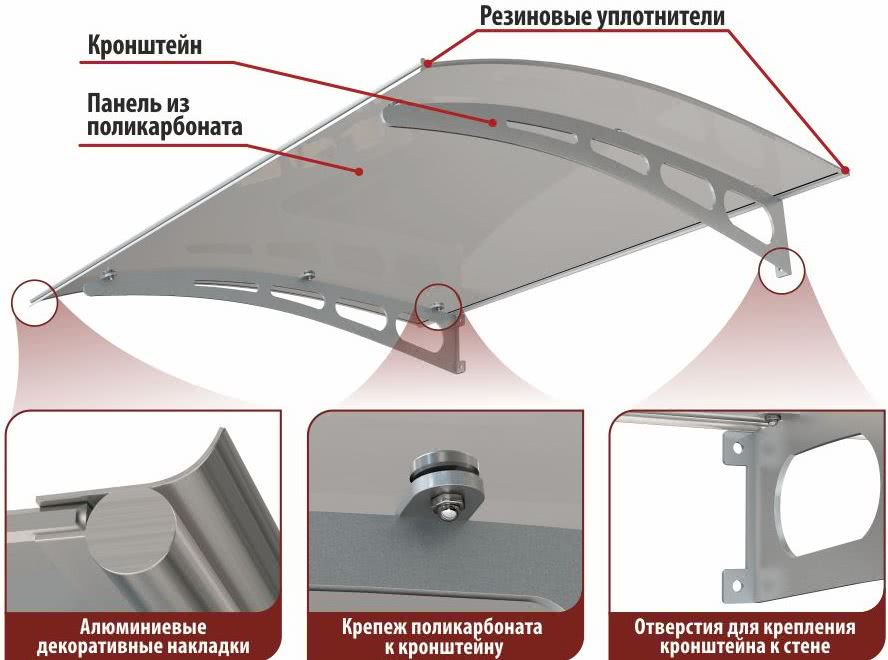 Сборка и монтаж козырька над парадным входом многоквартирного дома не является особой проблемой. Это объясняется простотой всей конструкции. Есть три основных компонента, который должны обязательно присутствовать: