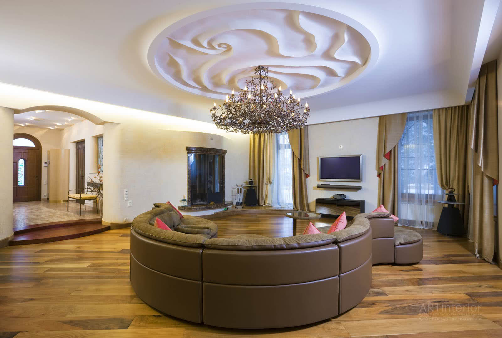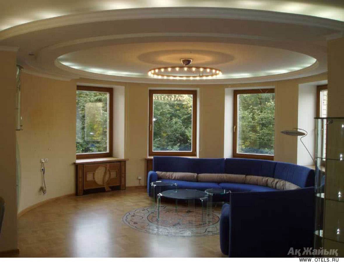 Эффектно выглядит потолок, оформленный в виде полусферы. Он может размещаться в середине комнаты с креплением на основание точечных светильников. Сюда же можно добавить лепнину или другие возможные дополнительные дизайнерские элементы.