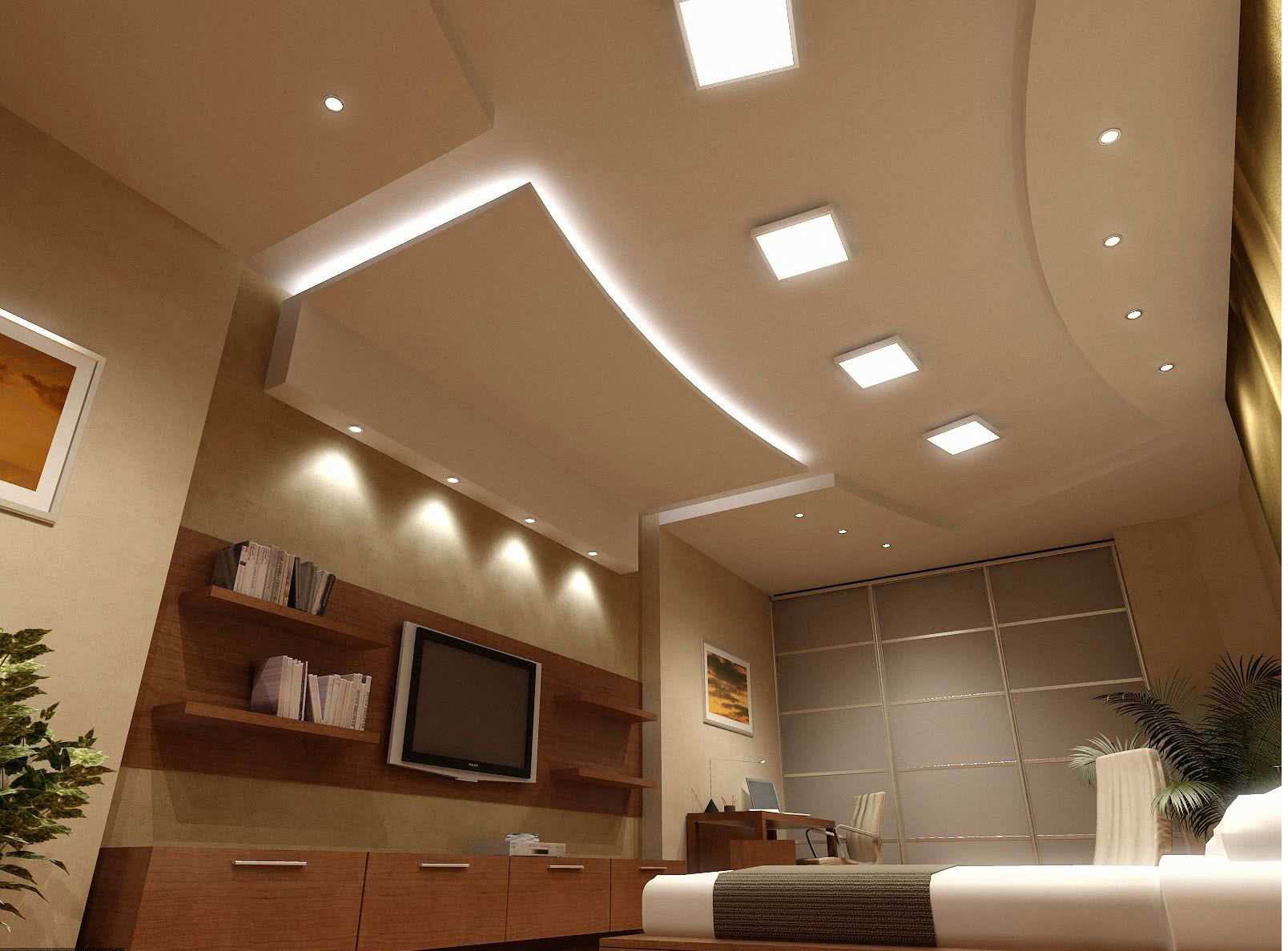 Иначе обстоит дело в больших комнатах, площадь которых более 20 кв. м. Многие желают сделать в них неповторимый дизайн с помощью многоярусных потолков с подсветкой. Для просторных помещений можно смонтировать каркас из гипсокартона в 2 – 3 яруса, снабдить его боковым скрытым освещением или встроенными галогенными, светодиодными, люминесцентными лампами.