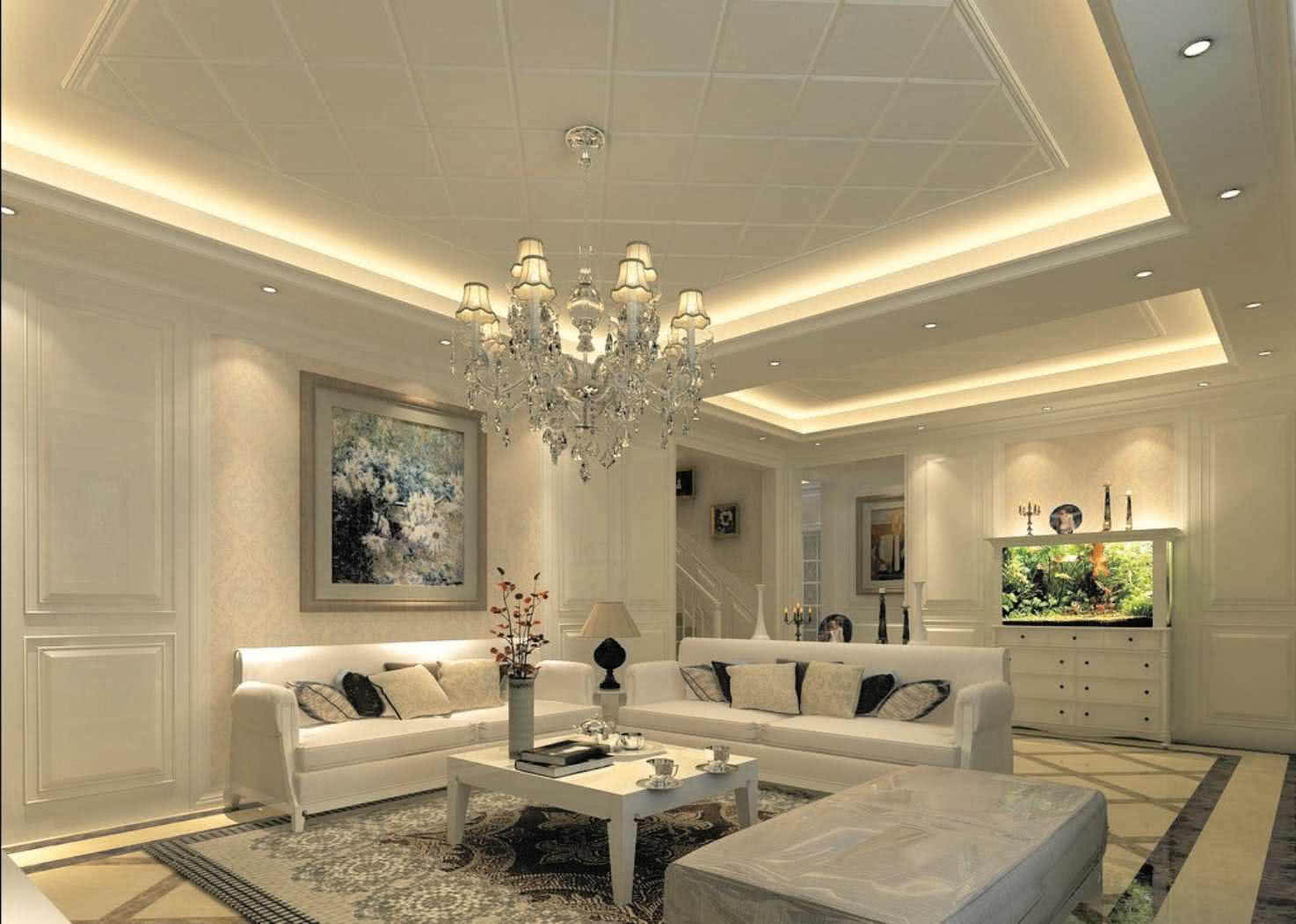 Некоторые примеры использования люстр в комбинации с точечными источниками света и LED-лентами можно увидеть на следующих фото гипсокартонных потолков для гостиной.