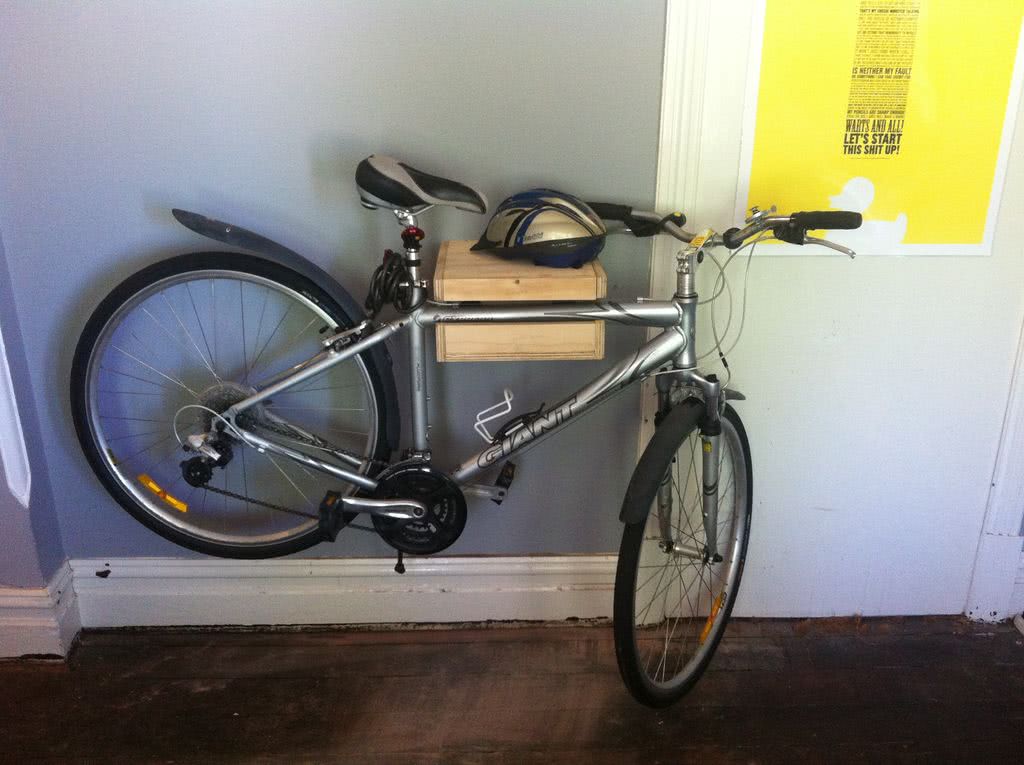 - Из-за размеров и частых ошибок при самостоятельной установке такое крепление остаётся одним из самых ненадёжных. Постоянная большая нагрузка на, зачастую, единственный саморез или дюбель приводит к неприятным последствиям в виде упавшего (иногда на хозяина) велосипеда.