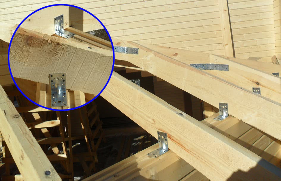 Уголки, прикручиваются шурупами к верхней грани бруса с двух сторон от стропила и прикрепляются к нему. Для большей надежности уголки следует брать с двумя рядами отверстий и ребром жесткости. Крепление уголками