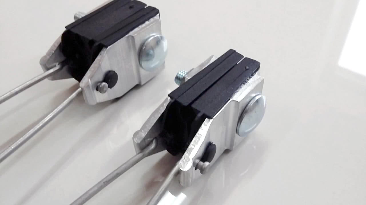 С помощью этих зажимов крепят СИП с изолированной несущей нейтральной жилой. Анкерный зажим состоит из корпуса и самонастраиваемых клиньев, позволяющих бережно зажимать нейтральную жилу. Благодаря гибкому тросику можно устанавливать до трёх зажимов на одном кронштейне.