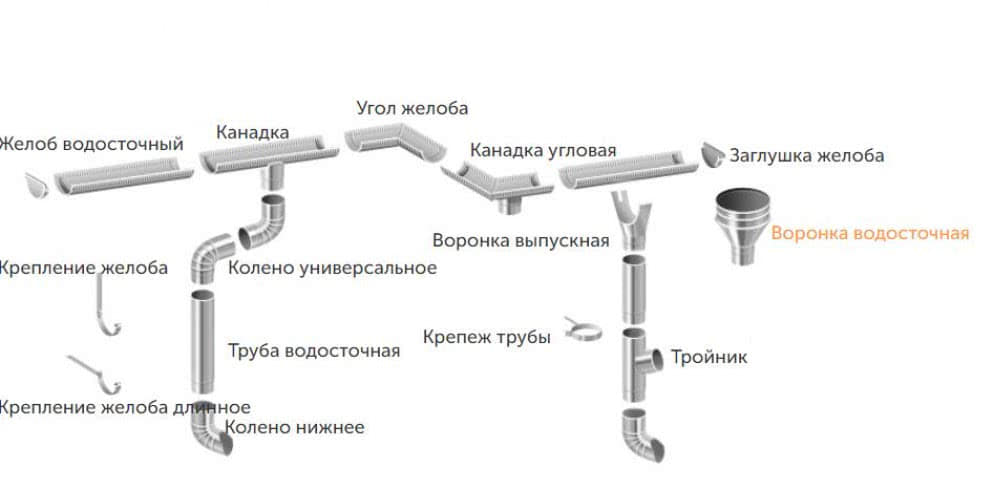 Разумеется, что одной водосточной трубой организовать водоотвод не удастся, поэтому вместе с ней монтируются: