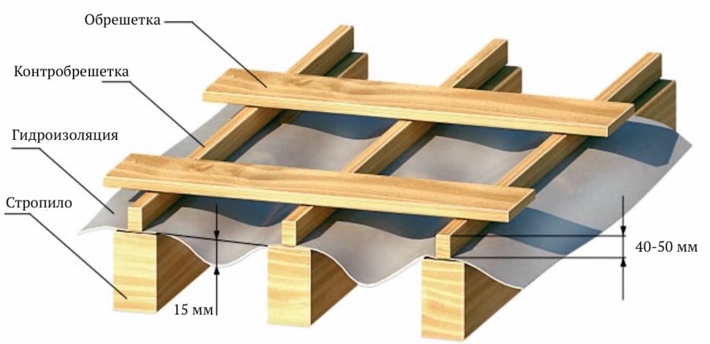 Контробрешетка монтируется с внешней и внутренней стороны стропил. При закреплении контробрешетки с внешней стороны она должна располагаться на гидроизоляционной пленке и вдоль стропильных ног под обрешеткой. В таком случае она за счет образовавшегося под кровельным материалом пространства отводит весь конденсат и создает вентиляцию слоя теплоизоляции.