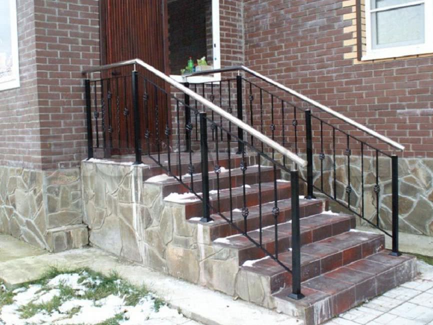 Возведение крыльца может учитывать и дополнительные конструкции – перила из металла или дерева, козырек. Особенно эффектно выглядят кованые конструкции.