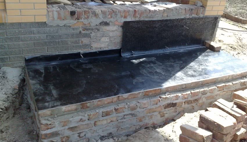 Гидроизоляция фундамента крыльца обязательна — для её устройства достаточно выстелить рубероидом дно котлована и внутреннюю поверхность опалубки. Для армирования можно обойтись несколькими кирпичами, на которые кладется сетка или крепится решётка из кусков арматуры.