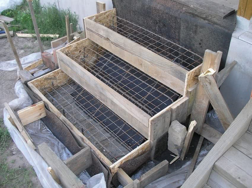 Как выставить опалубку? По высоте она должна на 30 см превышать высоту бетонного крыльца, поскольку ее нижняя часть входит в грунт. Затем намечаются боковые щетки опалубки, места расположения подступенек и проступей. Для формирования их каркаса используются доски необходимой ширины. Детали опалубки соединяются между собой и фиксируются при помощи распорок. Это обеспечивает прочность всей конструкции.