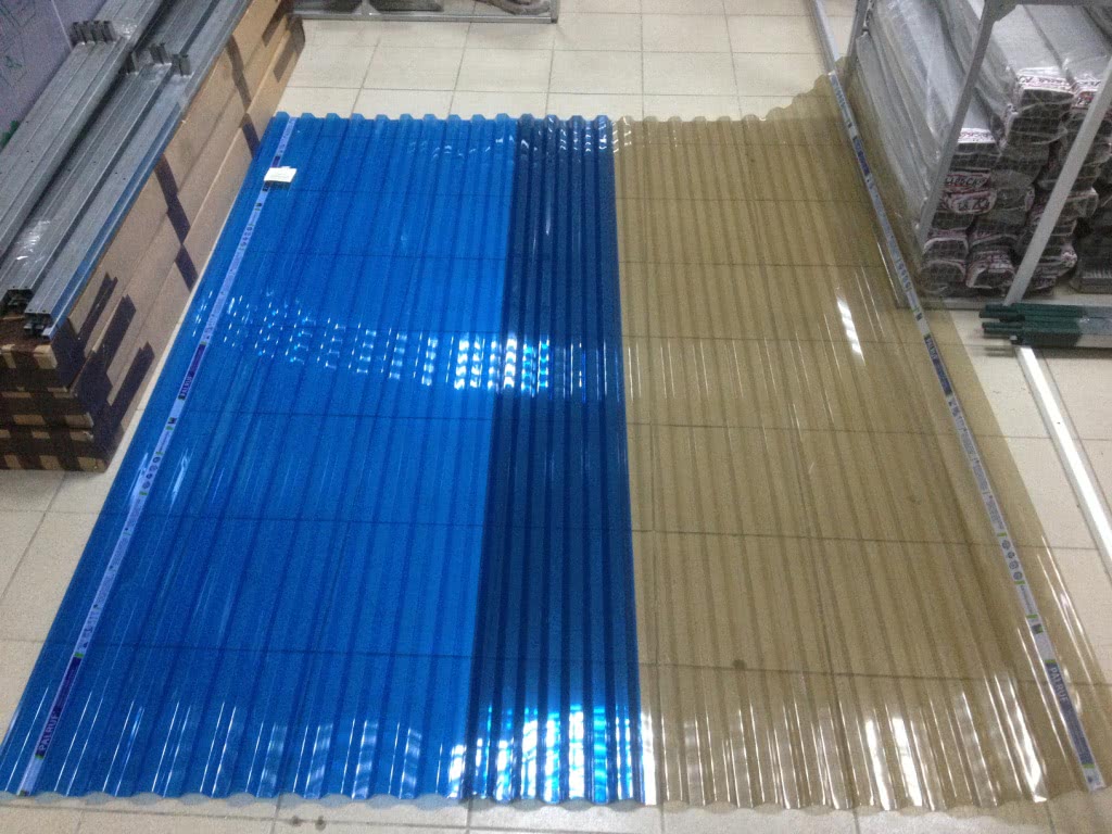Цвет профилированного поликарбоната может быть различным, как и степень прозрачности. Прозрачный поликарбонат бывает бесцветным и цветным, он пропускает от 60% до 95% солнечных лучей. Полупрозрачные листы могут быть окрашены в любой цвет, в том числе в дымчатые и матовые оттенки. Непрозрачные листы, как правило, имеют сочные и яркие цвета, иногда используют белый, молочный и бежевый.