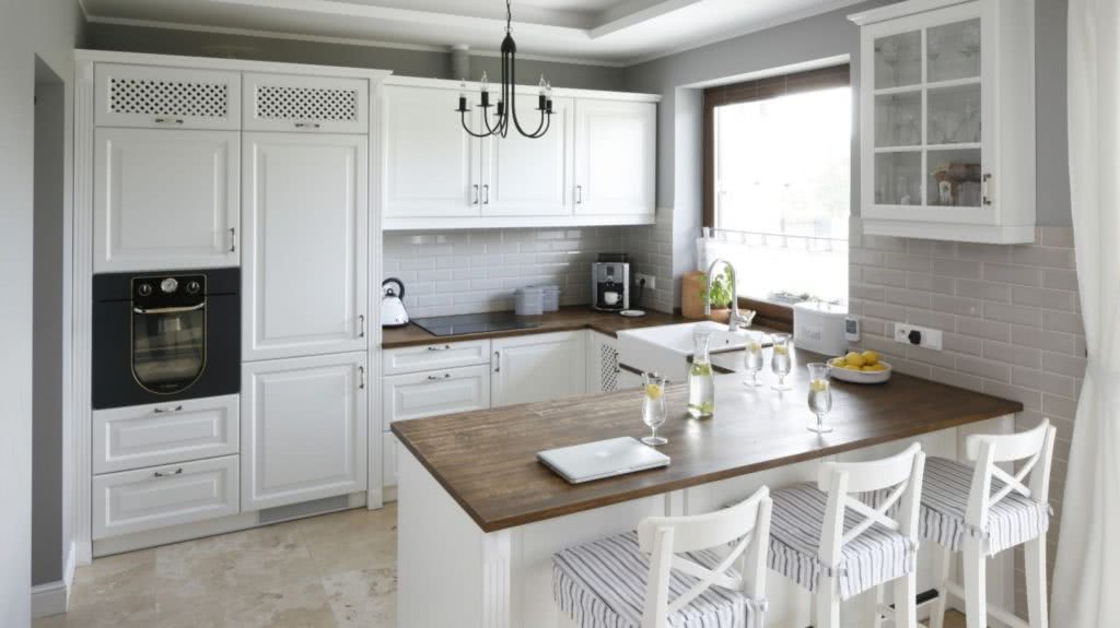 В случае очень узкой кухни стоит установить ряд шкафов с одной стороны комнаты. Если, с другой стороны, она имеет форму прямоугольника или квадрата, то хорошим решением является расстановка мебели в форме буквы «L». Свободное движение по кухне между мебелью и стеной обеспечит вам расстояние не менее 120 см. На кухне площадью 5 м2 и меньше лучше использовать шкафы с раздвижными дверями.