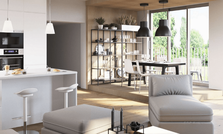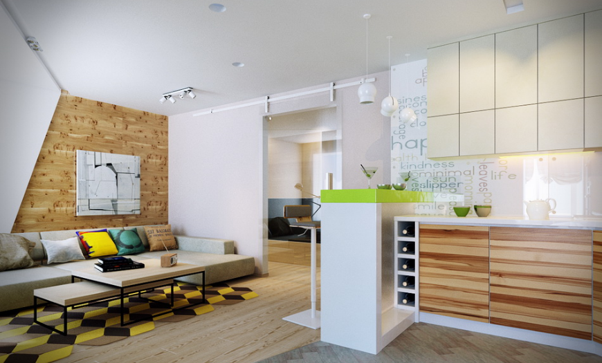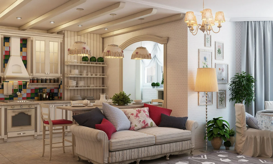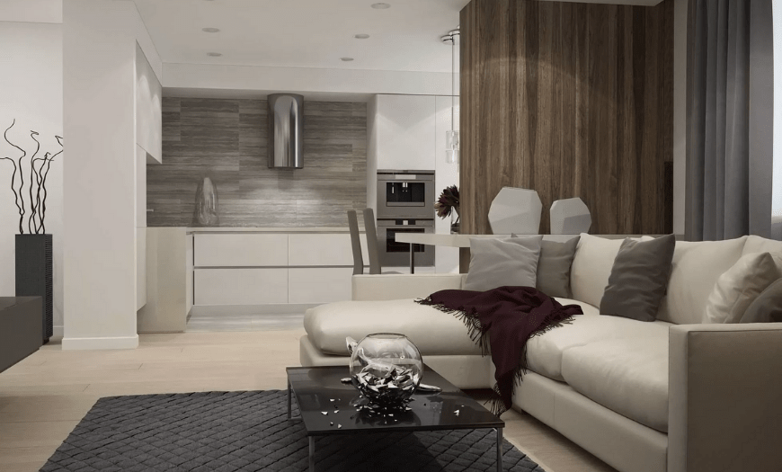 Сохранить иллюзию единого пространства позволит прозрачная перегородка между кухней и комнатой, сквозной стеллаж или гипсокартонная конструкция с нишами с обеих сторон. Перегородки бывают мобильными и стационарными. Первые позволяют быстро менять облик помещения – например, прятать кухню от посторонних глаз – очень удобно на случай прихода гостей.