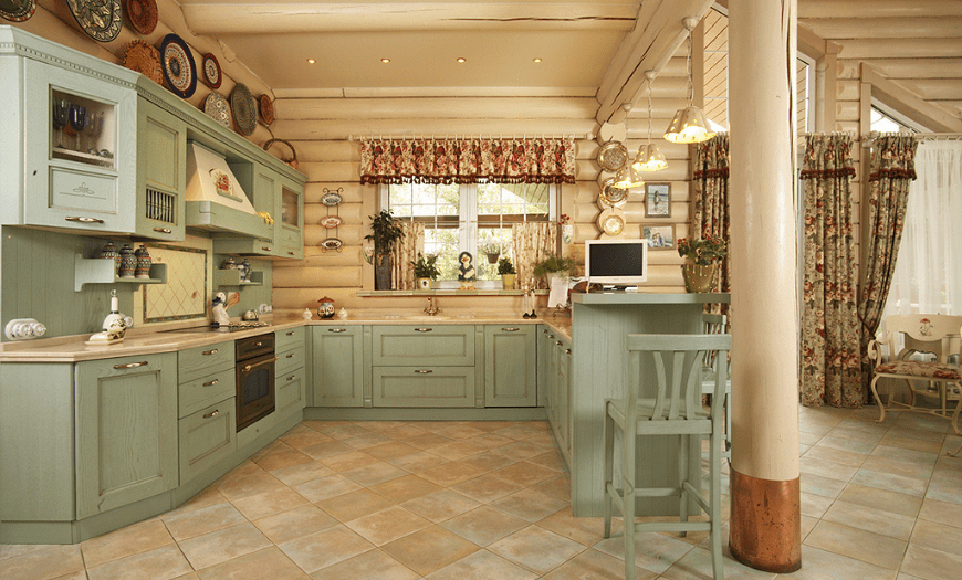 Основные черты – сдержанные постельные тона, минимум ярких цветовых акцентов, деревенская простота, искусственно состаренная мебель и природные материалы. Отделка не приемлет глянца, позолоты, контрастности.