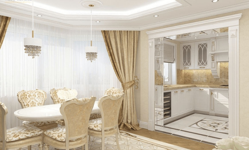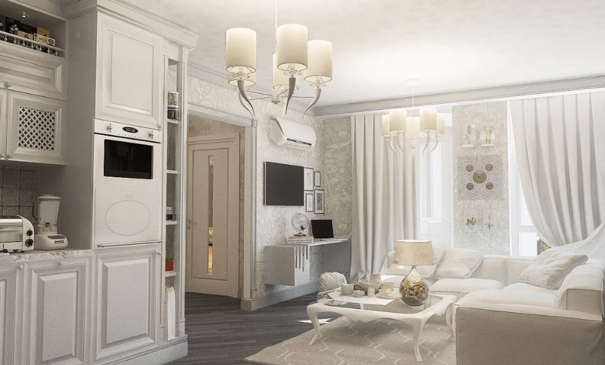 Неоклассицизм предполагает старое, но в новой интерпретации. Преобладают светлые оттенки и простота, доминирует классическое оформление дизайна, нет загруженности мебелью и техникой.