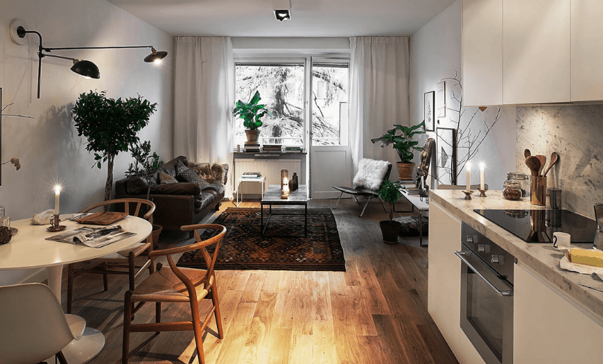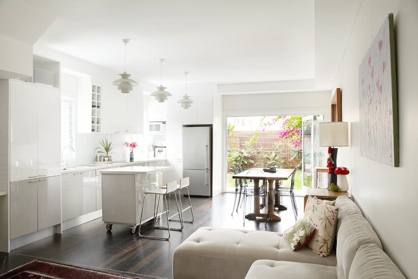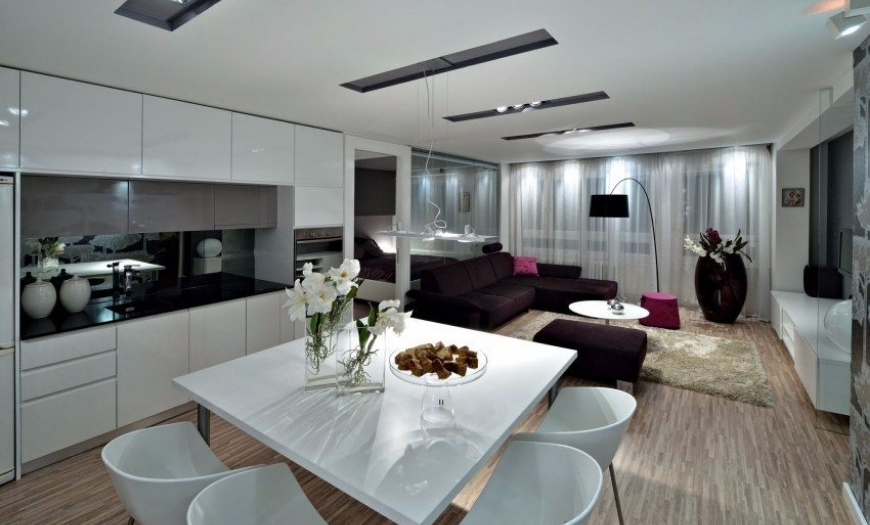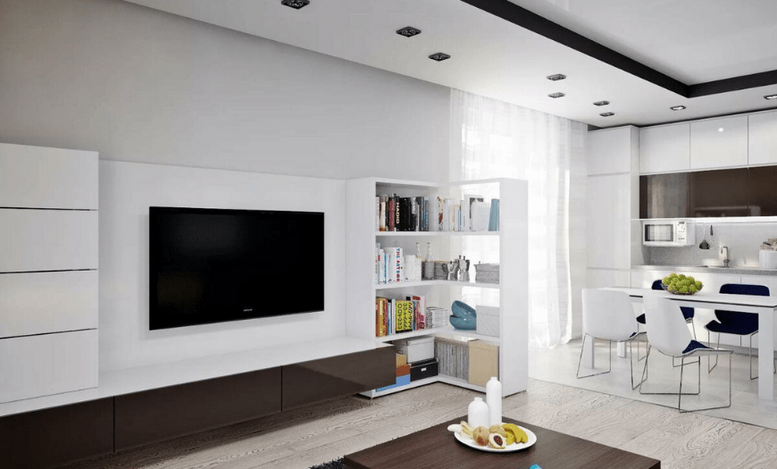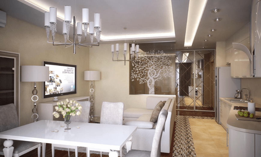 Отличным решением для небольшой квартиры будет объединение гостиной и обеденной зоны. Это позволит создать уютный уголок на скромной территории. Современный дизайн кухни гостиной часто представлен таким решением, когда часть мебели около обеденного стола заменяется уютным диваном. В этом случае в комнате необходимо найти место для телевизора.
