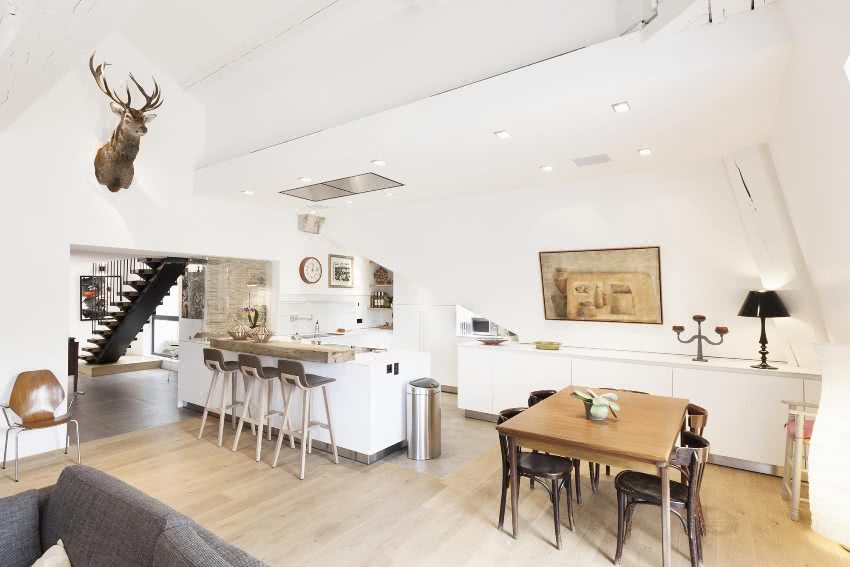 Идеален для объединенной кухни-гостиной. Не нужно скрывать технические элементы, например, кирпичную кладку. Стиль предполагает неоднородные поверхности, вдоль которых струится свет, создавая объемные тени.