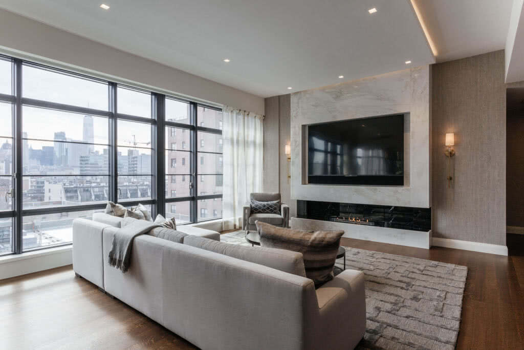 Вы можете обустроить гостиную с камином и телевизором, выбрав отдельно стоящий камин, который не должен находиться слишком близко к устройству, поскольку высокая температура его повредит. Вы также можете установить камин в углу стены, отделяющей кухню от гостиной, размещение которого обеспечит комфорт при просмотре ваших любимых фильмов.