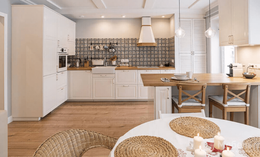 Иногда границы помещения обозначаются черной или темно-коричневой плиткой на полу, кухонный фартук делают контрастным, пролонгируя его до потолка. Часто чередуют белый фон и различные древесные элементы светло-желтого цвета. Также цветовые акценты делаются с помощью: