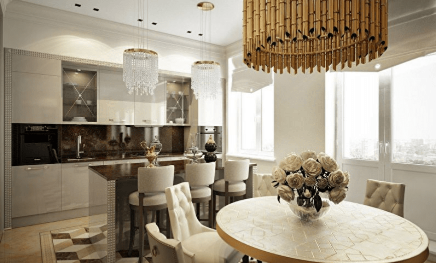 Самым главным и очевидным достоинством такого интерьера является увеличение площади. Ведь на очень маленькой кухне часто физически невозможно установить обычную кухонную мебель или простой обеденный стол, устроить комфортные семейные посиделки или организовать совместный ужин.